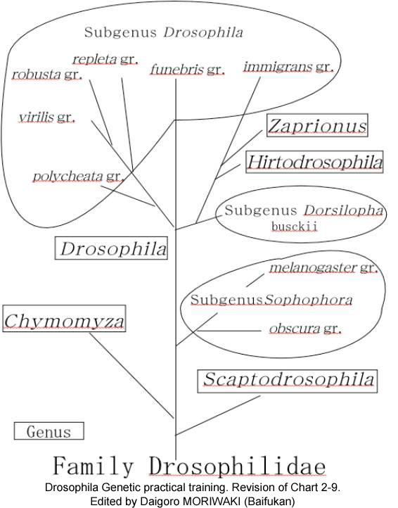 Due to uncertain taxonomic tree of Family Drosophilidae, researchers currently attempt to elucidate allied species in detail. The taxonomic tree below briefly shows Japanese Drosophila, which will be used in this workshop, with the latest classification based on Throckmorton (1975).